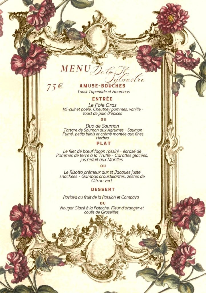 Veuillez noter que les boissons ne sont pas comprises dans le prix du menu de la Saint-Sylvestre.